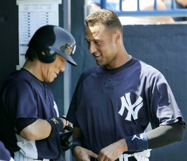 一見ジーターと談笑している様に見えるが、実はベンチの隅で一人ニヤけてるだけ。つまり遠近法でやっと顔のデカさが・・・